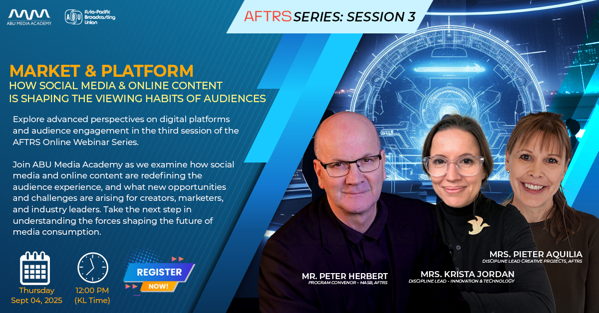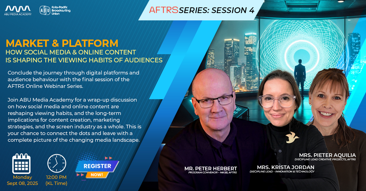 The ABU Media Academy invites you to an insightful and inspiring webinar featuring special guest speakers Peter Herbert and Dr Pia Aquilla from AFTRS, Australia.