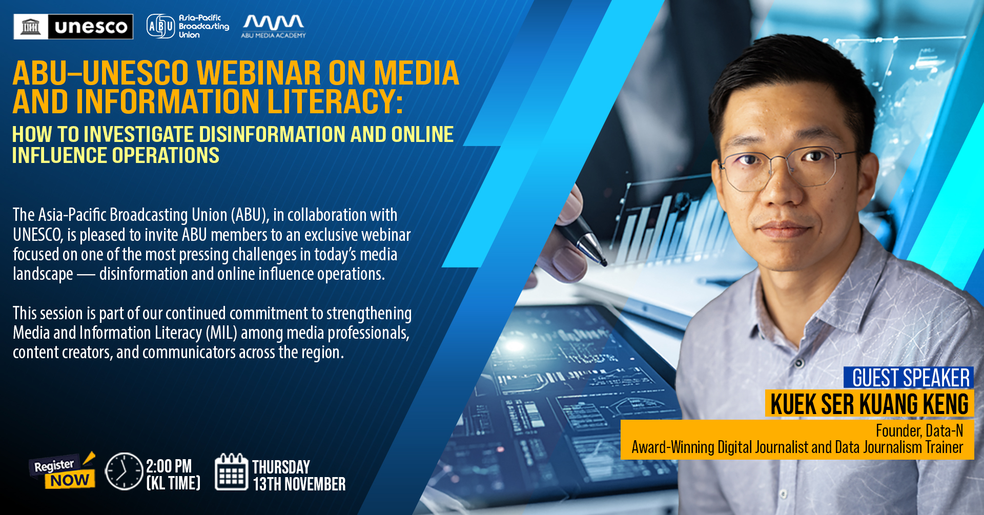 ABU–UNESCO webinar explores how media professionals can recognise, understand, and counter disinformation and online influence operations. The session supports the continued development of Media and Information Literacy across the Asia-Pacific region.